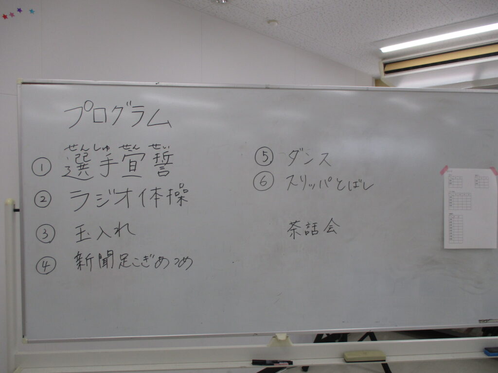 19日の土曜レクリエーションではミニ運動会を行いました。連日真夏日が続いていることもあり、エアコンの効いた細田内ホールにて開催。紅白二つのチームに分かれて三つの競技で競い合いました。
