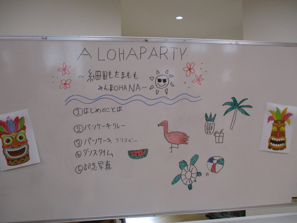 23日には細田とご近所さんとなる同くすのき会のたまも園と合同でレクリエーションを行いました。今回は「ハワイ」をテーマとしてダンスやゲームをして楽しみました。